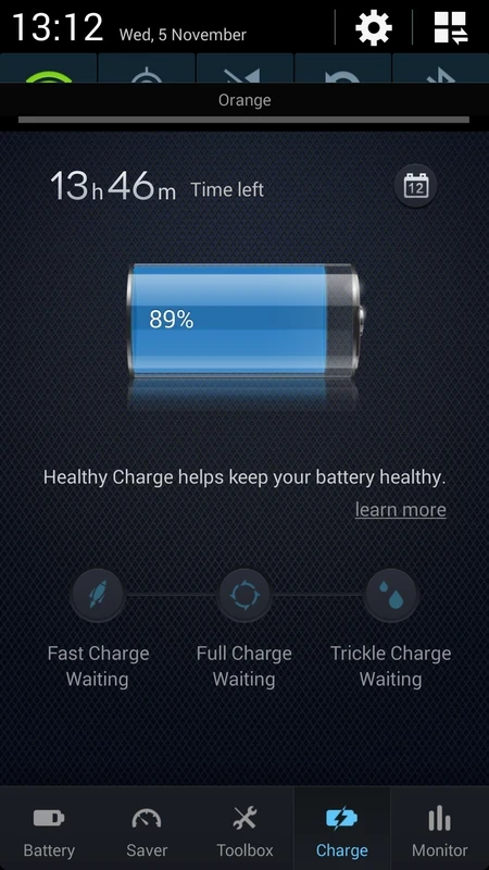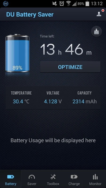 该应用程序在主页上提供电池电量和电量百分比,以及剩余电量/充电时间(直至电量耗尽或充电完成)。它还会显示电池运行所用的温度、技术和电压,以及其他一些重要选项,例如: